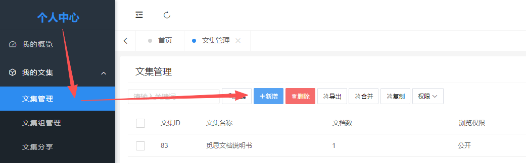 ## 如何创建文集(知识库)并进行基础配置 在觅思文档(MrDoc)中,文集是文档的容器,所有文档必须归属于一个文集。你可以将文档理解为知识,文集就是容纳知识的仓库,也就是知识库。 本文将介绍如何快速地创建文集、配置文集的基础信息 ### 一、文集的创建 你可以通过如下方式进行文集的创建。 #### 1、首页顶部的「新建」菜单  点击后,会进入到文集创建页面。在这个页面输入文集的基础信息(文集名称、简介、权限等)之后,点击创建文集即可。你也可以点击「创建文集并添加文档」按钮,这样在创建完文集之后会直接跳转到新建文档页面,直接进行文档的编写。 #### 2、个人中心 - 文集管理 在个人中心的文集管理页面,你可以直接点击「新增」按钮,来新建文集。  ### 二、文集的配置 文集创建好之后,你可以在个人中心文集管理页面对文集的基础信息进行配置。这些信息包括但不限于: - 文集名称 - 文集图标 - 文集自定义URL - 文集简介 - 文集内的文档排序方式 - 文集水印开关 - 文集评论开关